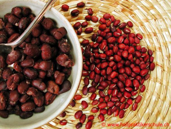 Krebs-Prophylaxe, Oligurie, Urinieren vermindert, Blutzuckerschwankung, Laktationsmangel, Milchbildungsmangel (Brei aus 120 g Azukibohnen und 30 g Rundreis; in zwei Portionen über den Tag verteilt essen; mehrere Tage wiederholen), Anämie, Blutmangel, Sicht verschwommen, Haare brüchig, Haarausfall, Hämatome, Thrombose