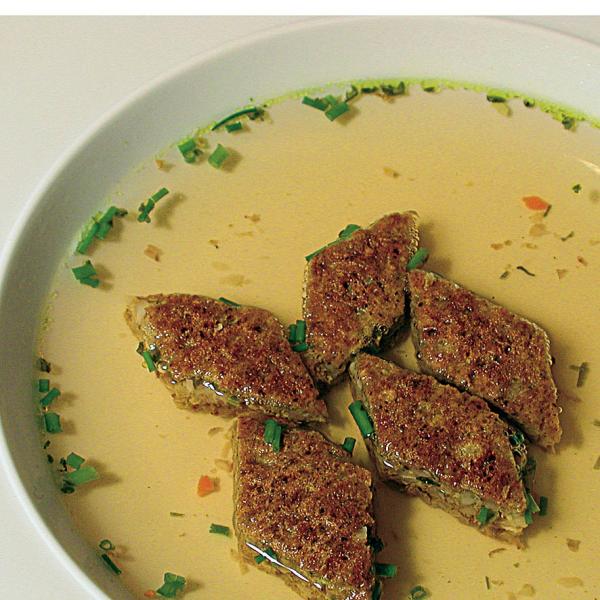 3. Den Fladen auskühlen lassen und in kleine Vierecke oder Rauten schneiden und als Einlage für klare Suppen verwenden.